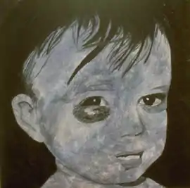 Lawson's own early work was situated at the crux of photography and painting, and combined deadpan, crudely modeled media archetypes (representing family, passion, violence and national iconography), which he isolated on modern, painterly fields of gestural marks or monochromatic grounds.[51][52] Decontextualizing overused painting techniques and snapshots drawn from tabloid stories, he sought to reconstitute and question their lost meaning and to expose the hollowness and insensitivity of conditioned responses to spectacle and tragedy.[53][54][39][55] Critics variously described his work (e.g., Don’t Hit Her Again or Shot for a Bike, both 1981) as haunted and difficult to like but worthy,[29][56][52][57] and "hard-headed and thoughtful [...] with a punk rock and painterly awareness."[36] Holland Cotter deemed it "painting out on strike," with an "obdurate, stonewalling quality that read like provocation";[58] others, such as Carrie Rickey, found the ambiguity of the work's intention to be troubling.[40][59][56]