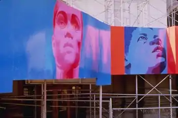 Lawson's own art extended beyond the canvas first to installation[70][73][74] and then into public space with Civic Virtue/Civic Rights (1988), a temporary work in City Hall Park in New York.[75][76] It was the first of several public works that examined traditional public sculpture and its relationship to dominant power structures by translating such representations into other contexts.[6][77][78] For the five-year commission, A Portrait of New York (1989), he covered a one-third mile length of scaffolding parapet during renovation of the city's Municipal Building with bright blue and orange, casually rendered imagery drawn from local civic statuary, redressing the short shrift given women and minorities in public sculpture by shuffling their images with those of monumentalized historical figures such as Alexander Hamilton, Nathan Hale and Al Smith.[78][49][79] In 1990, he created Memory Lingers Here for the First Tyne International Exhibition in Newcastle upon Tyne, England, a 30-billboard installation that enveloped a derelict soap factory.[80][81] The work used imagery of St. George and the Dragon taken from a neglected, local war memorial in Old Eldon Square to comment on regional identity, memory, and the loss of place and social cohesion.[82][17][83] Some of Lawson's other public art-related projects include billboards in New Haven, Connecticut (1988) and Bellgrove Station, Glasgow (1990),[84][16] and Fallen Angels (1991), an installation based on local statuary imagery and created for the socially committed Circulo de Bellas Artes show, "El Sueño Imperative," in Madrid.[85][86]