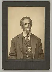 To honor Thomas Mundy Peterson as the first African-American voter after the passage of the 15th Amendment, the citizens of Perth Amboy raised $70 ($2300 in 2022 dollars) to award him with a gold medal. The full medal consists of a gold bar from which a two-inch diameter medallion was hung. The hanging medal featured a profile bust of a clean-shaven Abraham Lincoln. It was presented to Thomas Mundy Peterson on Memorial Day, which was then called Decoration Day, May 30, 1884.[6] The celebrations included a mass meeting to honor Mr. Peterson, held at the City Hall. The committee in charge was composed of James Lawrence Kearny, Patrick Convery, both of whom had been city officials; J.M Boggs, former collector of the port; Alderman John Fothergill; Ex-Mayor Uriah Burdge Watson; and I.T. Golding, former city official. The committee was representative of the Democratic and Republican parties. There was a program of speaking in tribute to Mr. Peterson, presided by Mayor James M. Chapman. The Reverend Dr. David Stevenson, Pastor of the Presbyterian Church, delivered the invocation. The principal speaker was Ex-Mayor William Paterson, Judge of the Court of Errors and Appeals. James Kearny, on behalf of the people of Perth Amboy, presented Mr. Peterson with his medal, which he is said to have loved and never considered himself properly dressed without it affixed to his left breast.[7][8]