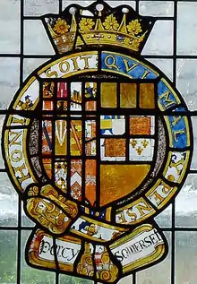 17th century stained glass escutcheon showing arms of Thomas Percy, 7th Earl of Northumberland (1528–1572), KG, (with 11 quarters) impaling Somerset (glass damaged/incomplete), paternal arms of his wife Anne Somerset, daughter of Henry Somerset, 2nd Earl of Worcester, the whole circumscribed by the Garter. Detail from Percy Window, Petworth House, Sussex