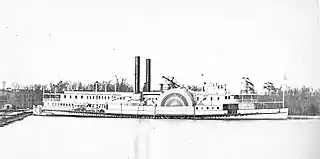 Thomas Powell, a wooden-hulled sidewheel steamer, was built by Lawrence & Sneden of Manhattan, New York,[3][2][4] under the supervision of her future captain, Samuel Johnson.[4] She was 231 feet 2 inches (70.46 m) long, with a beam of 28 feet 11 inches (8.81 m), draft of 5 feet 6 inches (1.68 m) and hold depth of 9 feet (2.7 m)[3][5] Her registered tonnage was 585.[3] A bust of her namesake was mounted on the pilot house roof.[6]
