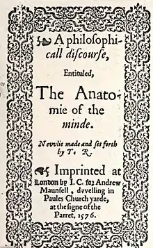 • A Philosophical Discourse, entituled the Anatomie of the Minde. London. 1576. This is a work on the passions from a largely Aristotelian point of view.[5] The front matter includes an epigram from William Camden, a poem by Abraham Fowler, and other poetry by Josua Hutten and Justinian Baldwin.