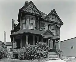 The Thomas S. Sprague House was a 2+1⁄2-story Queen Anne / Shingle style house. The front facade had a variety of projecting and receding elements, and a variety of surface treatments, creating an asymmetric composition with rich texture. A one-story hipped roof porch covered the center entrance, and wrapped around a corner octagonal turret. To the side of the entrance was a triple window surmounted with stained glass. Double hung first floor windows in the turret were also topped by arched stained glass sections. The turret was topped with a gable which made the structure into a bay window. Another bay window was set into the opposite side of the facade.[3]