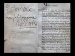 Burns also presented White with his personal copy of Voltaire's rare La Pucelle (Paris, 1775} which is still extant.[1][3][4] Inscribed on the reverse of the title page is: "To Mr. White, un petit gage d'amitié, Robt. Burns." This volume was sold at an 1928 auction in London for £80. A signature on the other side of the same leaf is "Wm. White" who could William have been a son or grandson of Thomas, adding his signature some years later.