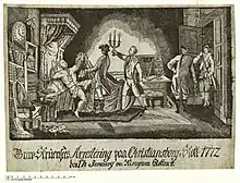 The arrest of Struense. Malleville is seen with a private soldier by the door on the right hand side of the picture