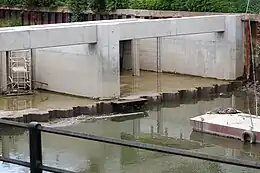The Bow Back Rivers were difficult to navigate, since at low tide there was insufficient water, and at high tide, there was inadequate headroom, particularly where the channels were crossed by the Northern Outfall Sewer.[5] As part of the regeneration of the area connected with the 2012 London Olympics, plans were developed for the refurbishment of the rivers, to maintain them at an intermediate level.[6] It was hoped that they could be used to deliver significant volumes of building materials for the construction of the stadium.[7] In order to achieve this, a new lock and sluice structure was built on the Prescott Channel, but in order to maintain water at the desired levels, a sluice to prevent water bypassing the new structure was necessary on the Three Mills Wall River, and so Three Mills Wall River Weir was built a short distance above Three Mills.[6]