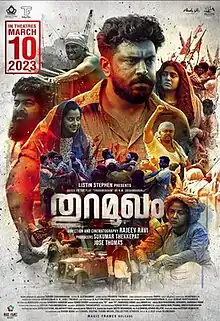 Thuramukham (transl.Harbour) is a 2023 Indian Malayalam-language period drama film directed and filmed by Rajeev Ravi and written by Gopan Chidambaran. It is based on the play of the same name by K. M. Chidambaran, Ravi's father.[3][4][5] The film stars Nivin Pauly, Indrajith Sukumaran, Joju George, Arjun Ashokan, Sudev Nair, Manikandan R. Achari, Senthil Krishna, Nimisha Sajayan, Poornima Indrajith and Darshana Rajendran in prominent roles. In the film, the harbor workers protest against the Chappa labor allocation system practiced during the 1940s and 50s in Cochin district of Kerala.