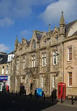 The building was financed by a local landowner, Alexander Henderson, who left £1,000 in his will towards the cost of a new burgh hall.[1][2] The foundation stone for the new building was laid in 1868: it was designed by John Russell Mackenzie in the Gothic Revival style, built in ashlar stone at a cost of £2,500 and was officially opened on 14 January 1871.[3][4][5]