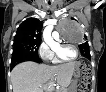 Early-stage thymic carcinoma is generally asymptomatic, and the development of symptoms is indicative of an advanced stage cancer.[3] Signs and symptoms are non-specific and include chest pain, persistent cough, and difficulty breathing, which are related to progressive tumor compression of anterior chest wall structures.[4] Superior vena cava syndrome may be associated with thymic carcinoma.[3] Thymic carcinoma is rarely associated with paraneoplastic syndromes, unlike thymoma which has a strong association with myasthenia gravis.[5]