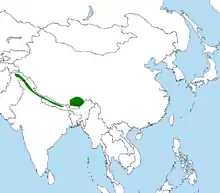 The Tibetan blackbird is found locally in the Himalayas of India, Pakistan, Nepal, Bhutan, and China. During the breeding season, it inhabits steep grassy, rocky slopes and alpine meadows just above the tree line at elevations of 3,200–4,800 m (10,500–15,700 ft). In the winter, it descends to lower elevations, but rarely goes below 3,000 m (9,800 ft).[11]