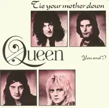 "Tie Your Mother Down" is a song by the British rock band Queen, written by lead guitarist Brian May. It is the opening track and the second single from their 1976 album A Day at the Races. On its original release as a single in 1977 the song peaked at 31 in the UK Singles Chart. More than 20 years later, it was released as a double a-side to "No-One but You (Only the Good Die Young)" where it reached 13 in UK Singles Chart. On the album the song is preceded by a one-minute instrumental intro featuring a Shepard tone melody, performed by Brian May, which is reprised in the ending of "Teo Torriatte": this was intended to create a "circle" within the album.