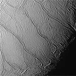 The tiger stripes of Enceladus consist of four sub-parallel, linear depressions in the south polar region of the Saturnian moon.[1][2] First observed on May 20, 2005, by the Cassini spacecraft's Imaging Science Sub-system (ISS) camera (though seen obliquely during an early flyby), the features are most notable in lower resolution images by their brightness contrast from the surrounding terrain.[3] Higher resolution observations were obtained by Cassini's various instruments during a close flyby of Enceladus on July 14, 2005. These observations revealed the tiger stripes to be low ridges with a central fracture.[2] Observations from the Composite Infrared Spectrometer (CIRS) instrument showed the tiger stripes to have elevated surface temperatures, indicative of present-day cryovolcanism on Enceladus centered on the tiger stripes.[4]
