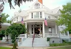 The Collins Mansion is a historic home in Great Falls, Montana, United States. The mansion was built in 1891 by Irish born Timothy Edward Collins, a local businessman who initially traveled to Montana during the gold rush. This, his second Great Falls residence was one of the town's first homes built on the west side of the Missouri River.[2] The brick home, now covered in a stucco facade from the 1960s, is classified as Edwardian and Norman Shaw Queen Anne styles and was Great Falls' first home to be listed on the National Register of Historic Places.[3] Despite the now hidden brick facade, much of the original, exterior, Victorian details remain today untouched: classical modillions on the third floor dormer, egg-and-dart-crowned porch columns, dentillation beneath the cornice, and fluted pilasters flanking the mullions in the front windows. The mansion's interior contains quarter sawn oak, maple, cherry, birch, and eastern pine woodwork throughout.[4]