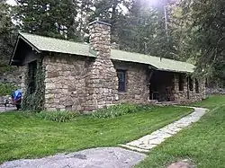 The structures are scattered on a steep landscape. The most significant building is the superintendent's residence, of rubble stone construction with a log-framed roof, covered with green shingles. The bridge is a single span built in 1935, using rubble stone. The 1935 Comfort Station restroom (presently named Last Chance restroom) is built on a ledge on the mountainside, and has a nearly flat concrete roof faced with stone. The 1928 comfort station is larger and built with a shingled roof. It is no longer used as a restroom. The rubble storage building is covered with a flat concrete roof. There are also two cold cellars on the site, both built about 1930. The trail climbs the cliffs for between one and 1.5 miles (2.4 km), its vertical climb of 1,065 feet (325 m) supported by stone retaining walls.[2]