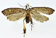 The wingspan is 16.5–19 mm for males. The forewings have a brown ground color, shining dark purplish, scattered with conspicuous white spots throughout, regularly arranged along margins as well as between veins. The hindwings are pale grayish brown, shining dark purplish, with small pale dots apically.