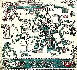 Tláloc was also worshipped during the Huey Tozotli festival, which was celebrated annually.[35] Evidence from the Codex Borbonicus suggests that Huey Tozotli was a commemoration of Centeotl, the god of maize. While Tláloc is not normally associated with Huey Tozotli, evidence from the Codex Borbonicus indicates that Tláloc was worshipped during this festival.[35] Additional evidence from the Book of Gods and Rites suggest rulers from the Aztec Empire and other states would make a pilgrimage to Cerro Tláloc during the Huey Tozotli festival in order to present offerings to Tláloc.[35] The Book of Gods and Rites also suggests that a child was sacrificed as a part of this pilgrimage as well, although this could simply be the result of colonial sensationalism on the part of the Spanish authors.[35] It is argued that Tláloc was incorporated into celebrations of Huey Tozotli because of his role as the god of rain.[35] Huey Tozotli was a celebration of the maize harvest, and it would make sense that worshippers might want to celebrate Tláloc during this festival as his powers of the rain would be critical to having a successful harvest of maize.[35]