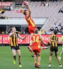 Meanwhile, media speculation continued over Lynch's contractual future, with reports claiming Hawthorn, Richmond and Collingwood remained front runners to sign him.[101] In mid-July Suns coach Stuart Dew said he believed Lynch was unlikely to stay and less than a week later Collingwood coach Nathan Buckley admitted he had met with Lynch and his management about a potential Collingwood offer.[102][103] In early August Lynch informed Suns players, coaches and front office staff of his intention to leave the Gold Coast and sign a free agent contract with a Melbourne-based club at the end of the season.[104] He was reportedly met with strong criticism by teammates upon the announcement and was subsequently stripped of his captaincy by the club and stood down from all duties other than those that concerned his continuing knee injury rehabilitation.[105][106] An AFL Media report that same week claimed officials at multiple clubs believed Lynch was near-certain to join Richmond despite no official decision having yet being made.[107] The Age's Caroline Wilson reported in late August that Lynch would join Richmond and in September another report by The Age said he had informed Collingwood and Hawthorn that he would not sign with them despite refusing to confirm his decision publicly before the end of that year's finals series.[108][109][110] Within a week of the season's end, Lynch confirmed he would sign with Richmond, accepting what was reported to be a seven-year deal worth $6.5 million, heavily backloaded and beginning with around $500,000 in its first year.[111][112]