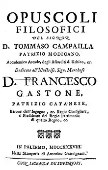 Tommaso Campailla was born in Modica, near Syracuse, in 1668. His family belonged to the local nobility.[1] At sixteen he was sent to Catania to study law. He employed his leisure hours in the study of literature, philosophy, science, astronomy, and physics.[1] He studied both neo-Scholastic and Cartesian philosophy, and adopted a mechanical view of the universe.