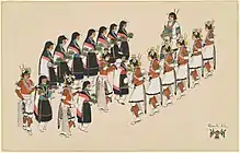 In 1931, Tonita Peña exhibited at the Exposition of Indian Tribal Arts which was presented at the Grand Central Art Galleries in New York City.[2][11] Works from this exhibition were shown at the 1932 Venice Biennial. That year is the only time Native American artists have shown in the official United States pavilion at that biennial, and Tonita Peña's paintings were part of that exhibition.[12] Her painting Basket Dance, that had shown in the Venice Biennial was acquired by the Whitney Museum of American Art in New York for $225.[13] This was the highest price paid up to this time for a Pueblo painting and most Native American paintings at this time were selling between $2 and $25.[2]