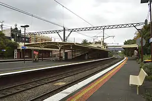 Toorak railway station is a commuter railway station on the northern boundary of Armadale, a suburb of Melbourne, Victoria, Australia.[3] The station is listed on the Victorian Heritage Register, and was opened on 7 May 1879.[4] The station is named after the nearby suburb of Toorak—located north of the station. The station consists of an island platform and two side platforms all accessed by a pedestrian bridge. There are two principal station buildings located on the central platform (platforms 2 and 3) and on platform 4, consisting of a small two and one-story brick buildings.[5] These buildings were provided in 1914, as ticketing and staff offices. The station is only partially accessible due to a multiple steep access ramps.[6]