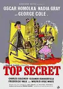 Top Secret is a 1952 British black and white comedy film directed by Mario Zampi and starring George Cole, Oskar Homolka and Nadia Gray.[2] A sanitation inspector is mistaken for an international spy. It was shot at the Elstree Studios of Associated British. The film's sets were designed by the art director Ivan King. The film was released in the United States as Mr. Potts Goes to Moscow.[3]