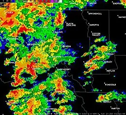 The strongest tornadoes of the outbreak took place across the Arklatex region during the afternoon hours, where the strongest and lone killer tornado of the outbreak took place. At 3:52 PM, a supercell thunderstorm spawned a tornado over Cross Lake, north of Shreveport Regional Airport. The tornado moved northeast. In Caddo Parish the tornado damaged 66 buildings. In Caddo Parish, damages were estimated at nearly $1.6 million (2006 dollars).[1] At 4:01 PM, the tornado entered Bossier Parish as an F4 tornado. In Bossier Parish, 227 buildings suffered major damage or were destroyed. An additional 162 buildings were damaged. Damages in Bossier Parish are estimated at near $6.7 million (2006 dollars).[2] The tornado dissipated about eight miles northeast of Benton. In all, 7 people were killed and 102 were injured. The tornado was on the ground for about 20 miles. It reached a maximum width of 200 yards. It was Louisiana's deadliest tornado since February 21, 1971, when 10 people were killed east of Delhi.[3]