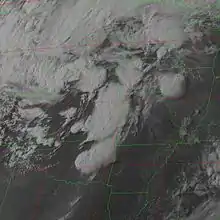 By the afternoon hours, rapid destabilization of the boundary layer began across eastern Kansas, prompting a tornado watch for the area.[31] Further south in Oklahoma, a rapidly mixing dry line accompanied by a deepening surface low moved eastward into an area with deep moisture. Though leftover outflow boundaries from the previous day's storms and capping limited initial convective activity, strong daytime heating would soon allow storms to break the cap.[32] A tornado watch was issued for the central third of Oklahoma at 2:15 p.m. CDT (1915 UTC), with the SPC noting the risk for potentially long-lived supercells and a few strong tornadoes.[33] Around 2:30 p.m. CDT (1930 UTC), a supercell developed over Harper County, Kansas and tracked northeastward. This cell produced three short-lived tornadoes, including an EF2 to the southwest of Wichita that prompted a tornado emergency for the city.[34][35] Over the course of three hours, 10 other tornadoes touched down across the state, none of which exceeded EF1 intensity.[5][34]