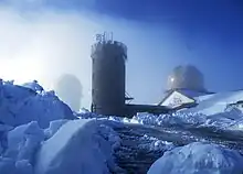 Torre is the culminating point of the Serra da Estrela range and as such tends to present the lowest temperatures and highest precipitation levels. The climate is defined as a transition between the typical Mediterranean climates seen south of the range and the not-so-typical oceanic climates found north of the range. Precipitation is very high, with around 2,400 mm (94 in), but when compared to lower valley regions of the range, rain is rather weak and continuous.[1] Snow can occur anywhere between October and May, mostly in February, but can be irregular.[2][3]