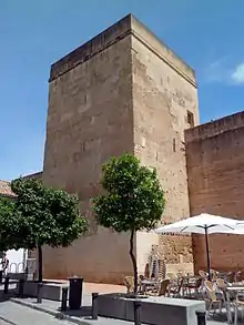The tower is square-shaped, the sides measuring 7.4 m (24 ft). Built of limestone ashlar blocks, arranged in alternating layers of headers and stretchers, it is accessed through two doors at right angles to each other. The outer door to the north has a pointed horseshoe arch while the inner door to the east leads into the ground floor which was once converted into a chapel. As a result, the building was also known as Torre de las Imágines (Tower of the Pictures) or Torre de San Benito (Saint Benedict's Tower). There are two upper floors in the tower, each with hemispherical vaulting. From the first floor, the city walls can be accessed through rounded arches to the north and south. The three rounded arches in the eastern wall once housed the chapel bells. There is disagreement as to whether the tower is of 12th-century Almohad origin or was built later during the Christian period.[3][4] It does however appear to have been consolidated as part of the defences following the Christian conquest of Córdoba in 1236.[5]