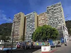 The Torres Gonzalo Jiménez de Quesada were constructed as part of the urbanization project in the late 1960s and 1970s.[2] They are locates in the centre of Bogotá; the locality La Candelaria. The complex of the five residential towers, each 72 metres (236 ft) in height, consists of 390 apartments, next to the Universidad de los Andes.[3] The towers are the highest buildings in the historical centre of the Colombian capital.[4]