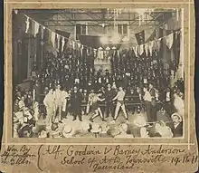 The new building had meeting rooms and class rooms on the ground floor with a large library above. Classes were held in such subjects as drawing, singing and woodwork. The first gas cooking classes in Townsville were held here in 1895 utilising a specially installed Darren gas cooker. Connected to this building was a theatre building, originally called Her Majesty's, which could seat 600 people. This was a large rectangular space rising to 2 storey height with a stage flanked by extensions housing dressing rooms. It was used by many visiting theatrical groups and performers, including a Chinese Opera company in 1894. It was the town's leading theatrical venue until the second Theatre Royal opened in 1900, although it continued to be popular after this, Nellie Melba appearing at the theatre in 1909. His Majesty's (as it was later renamed when King Edward VII succeeded Queen Victoria) was also the venue for the first Aboriginal stage performance in Townsville when a variety company, formed by local Aborigines performed there in 1907.[1] Boxing matches were also held there.[2]
