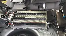 2021 reinstallation of original 2005 Prius hybrid battery, clearly showing the 28 modules, after replacement of several failed modules that caused the on screen red "triangle of death"