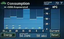 In-dash monitor on a 2005 Toyota Prius multi-function display, displaying accumulative fuel economy for 59 miles (95 km) since last gasoline fill-up.