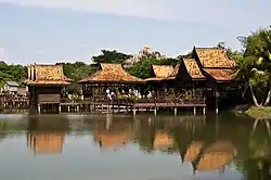 The earliest record of Cambodian housing is from the Chinese record of Funan kingdom (1st-7th century AD) where the residents were described as people who lived on stilt houses, cultivated rice and sent tributes of gold, silver, ivory and exotic animals.[2] The people built their houses over the ground and made them accessible by ladders as seen across Cambodia today. The Chinese accounts also mentioned the walled towns, dwelling houses and palaces.[3]