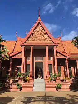 As Angkorian palace and royal residences were all wooden and the bas reliefs do not depicted the entirety of the royal residence compound, there are several alternative sources of comparison to reconstruct the appearance of the palace. Another suitable reference for the wooden royal palace of Angkor is the National museum of Cambodia in which it was modelled on traditional Khmer architecture that include wide range of Khmer decorative elements.[4]