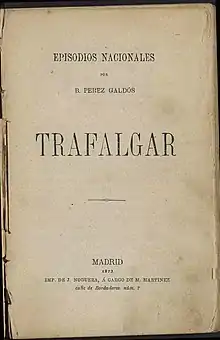 "Trafalgar" is a novel by Spanish author Benito Pérez Galdós[1] and the first novel of the first series in the Episodios Nacionales (National Episodes). It was first published in 1873 in Spain. The novel is set at the beginning of the 19th century and narrates the Battle of Trafalgar during the Napoleonic Wars.