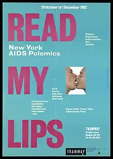 - ↑ "Two men kissing; advertisement for an exhibition about New York AIDS Polemics by Tramway. Colour lithograph, 1992". Wellcome Collection. Retrieved 28 January 2021.