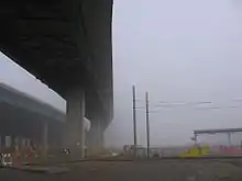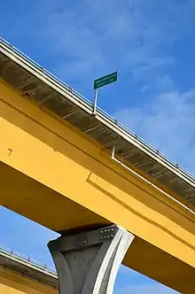 I-5 in Downtown Sacramento at the far left, with the I Street on-ramp to its right, looking up from a surface street