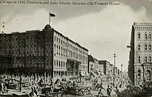 The original hotel's building was built in 1833. It was a three-story wooden structure located at the northwest corner of the intersection of Lake Street and Dearborn Street. It was lost to a fire in 1839.[1] It took its name from the Boston Tremont House.[2] It was later recounted by a reporter that he recalled the hotel having been a three-story frame structure approximately 80 ft (24 m) long and 70 ft (21 m) wide.[3]