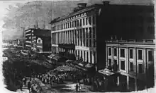 1853 illustration from Frank Leslie's Illustrated Newspaper of a crowd gathered outside the hotel for an event