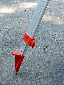 Many modern tripods are constructed of aluminum, though wood is still used for legs. The feet are either aluminum tipped with a steel point or steel. The mounting screw is often brass or brass and plastic. The mounting screw is hollow and has two lateral holes to attach a plumb bob to center the instrument e.g. over a corner or other mark on the ground. After the instrument is centered within a few cm over the mark, the plumb bob is removed and a viewer (using a prism) in the instrument is used to exactly center it.