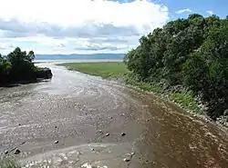 • 5.0 kilometres (3.1 mi) heading west, crossing the railway line and cutting route 132, to its confluence.[1]