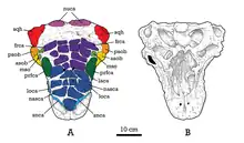 Tsagantegia was a medium to large-sized ankyosaur, with an estimated length of 6 to 7 m (20 to 23 ft)[2][3] and weighing about 1 to 4 t (2,200 to 8,800 lb).[3] The skull measures about 38 cm (380 mm) in length, with a near width of 25 cm (9.8 in), missing the lower jaws. Unlike other Asian ankylosaurs, in Tsagantegia the caputegulae (cranial ornamentation) are not subdivided into a mosaic of polygons but are amorphous and flattened; they show some degree of symmetry. The quadratojugal, squamosal and orbital horns are poorly preserved, in contrast with other ankylosaurs. The snout was long and flat with a pointed rostrum (beak); each maxilla preserves approximately 18 alveoli, no teeth were preserved.[1][2][4] According to Arbour, Tsagantegia differs from Gobisaurus and Shamosaurus based on the more rounded, U-shaped premaxillary beak and the flat ornamentation.[5]