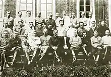 Upper row, left to right: 3. Romuald Muklevich, 4. Jānis Pauka, 5. Nikolai Sollogub, 6. Vilhelm Garf, 7. V. L. Baranovsky, 9. P. M. Oshley. Middle row: 2. Ieronim Uborevich, 3. David Petrovsky, 4. Iona Yakir, 5. Pavel Lebedev, 6. Stepan Danilov 7. Nikolai Petin, 8. Semyon Budyonny, 9. Boris Shaposhnikov, 10. Pavel Postyshev. Bottom row: 1. Vasily Shorin, 2. August Kork, 4. Vladimir Lazarevich, 5. Nikolai Muralov, 6. Sergey Kamenev, 7. Sergei Gusev, 8. Alexander Yegorov, 9. Kliment Voroshilov, 10. Dmitry Oskin. Date: 13 August 1921