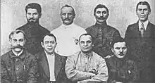 Retouched version of the full photo, only including officers of 1st Cavalry Army. Standing, left to right: P. P. Lebedev, N. N. Petin, S. M. Budyonny, B. M. Shaposhnikov. Seated: S. S. Kamenev, S. I. Gusev, A. I. Yegorov and K. E. Voroshilov in 1921.