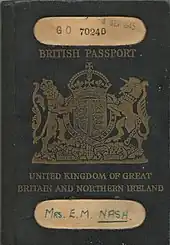 A British passport from 1945, with the royal coat of arms depicted with a Tudor Crown.