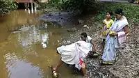 A priest performs a puja, or religious ceremony, to invoke the blessings of the gods, and the girl is married to a banana tree in a mock wedding.[11] During this event, neighboring families' women gather to sing traditional folk songs, which convey specific teachings to the young girl.[9] The girl is then given gifts of money, jewelry, and clothing.[7]