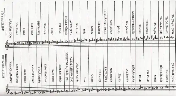 Unlike in Western music, where the note C, for example, is called C regardless of what octave it might be in, in the Turkish system the notes are—for the most part—individually named (although many are variations on a basic name); this can be seen in the following table, which covers the notes from middle C ("Kaba Çârgâh") to the same note two octaves above ("Tîz Çârgâh"):