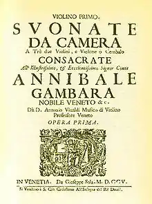 Twelve Trio Sonatas, Op. 1 is the first collection of musics composed by Antonio Vivaldi, and published by the Venetian publisher Giuseppe Sala in 1705, the first edition is believed to have been published around 1703. These sonatas are for two violins and basso continuo. The last music is a same title of "La Follia" as Corelli's Twelve Violin Sonatas, Op. 5.[1]