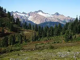 Twin Sisters Mountain (Nooksack: Kwetl’kwítl’ Smánit, "red mountain"),[3] commonly called the Twin Sisters, is a mountain in the U.S. state of Washington. Part of the Cascade Range, it lies just southwest of Mount Baker. Of its two main peaks, South Twin is higher, with a summit elevation above 7,004 feet (2,135 m).[lower-alpha 1][1] The summit of North Twin is above 6,644 feet (2,025 m).[lower-alpha 2][4] There are several glaciers on the northeast slopes of Twin Sisters Mountain.